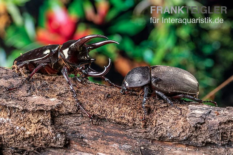 Chalcosoma atlas sind imposante Gestalten. Die riesigen Käfer sind interessant zu beobachten und dabei verhältnismäßig einfach in Pflege und Haltung. Für die optimale Unterbringung von Atlaskäfern empfiehlt sich eine Box mit einem Volumen von mindestens 100 l. Dreihornkäfer graben sehr gerne und sehr viel. Dieser Tatsachenbestand sollte bei der Haltung unbedingt berücksichtigt werden. Es ist von signifikanter Relevanz, dass die Käfer-Box über eine Bodenschicht aus Erde oder Humus verfügt. Des Weiteren ist es von Vorteil, den Tieren diverse Versteck- und Rückzugsmöglichkeiten anzubieten. Insbesondere Laub, Moos oder Äste werden von den Riesenkäfern gerne angenommen. Auf diese Art und Weise wird ein naturnahes Umfeld geschaffen und das Wohlergehen Ihrer Käfer um ein Vielfaches gesteigert. Atlaskäfer sind rabiate Gesellen. Insbesondere die Männchen neigen zu einer territorialen und aggressiven Verhaltensweise. Aus eben diesem Grund sollte man niemals 2 oder mehr Männchen in einer Box halten.
