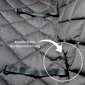 Das strapazierfähige Obermaterial besteht aus einem weichen Baumwollmischgewebe und ist somit extrem widerstandsfähig und von höchster Qualität. Die Füllung ist atmungsaktiv und verhindert so auch bei Feuchtigkeit die Entstehung eines unangenehmen Geruchs. Zudem befinden sich Öffnungen für den Sicherheitsgurt an der Decke.